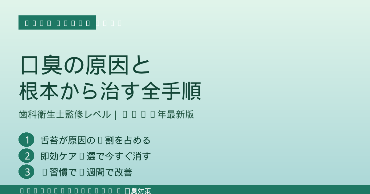 口臭の多くは舌苔・歯周病・ドライマウスの3つが原因。すぐできるケア(水・舌磨き・ガム)と毎日の7習慣で多くの人が1〜2週間で変化を実感しています。セルフケアで改善しない場合は歯周病が隠れているサインなので、早めに歯科を受診しましょう。