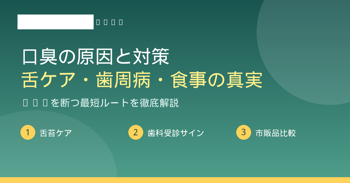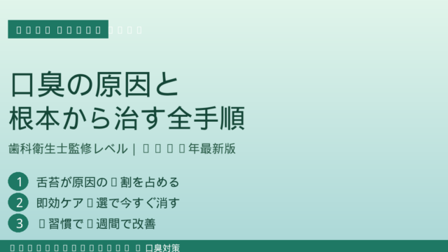口臭は単一の原因ではなく、舌苔・歯周病・虫歯・鼻・胃・食事・ストレスと多要因で発生します。まず舌ブラシ+マウスウォッシュ+水分補給の基本ケアを2週間続け、それでも改善しなければ歯科・耳鼻科を受診する——この段階的アプローチが最短ルートです。
