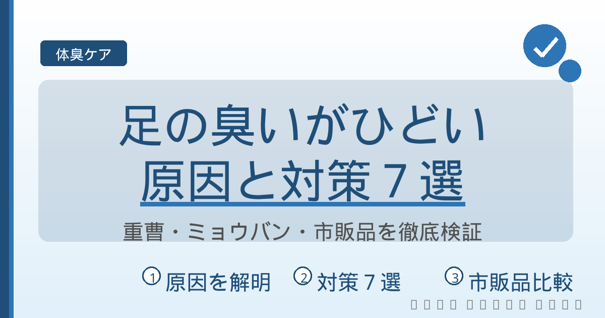 足の臭いの正体は「皮脂・古い角質 × 常在菌 × 高温多湿の靴環境」の掛け算。対策は①洗い方を変える、②足を乾かす、③靴をローテーションする、④消臭成分(ミョウバン・銀イオン)を活用する、の4本柱で9割の人は改善します。即効性重視なら「グランズレメディ」、コスパ重視なら「ミョウバン水スプレー」、根本改善なら「5本指ソックス+靴の2〜3日ローテーション」が最適解です。